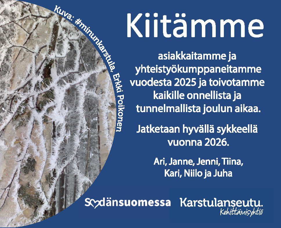 19.12.2025 | Ajankohtaista Toimistomme on suljettuna joulun aikaan Kehittämisyhtiö Karstulanseutu Oy:n toimisto on kiinni viikoilla 52/2025 ja 1/2026. Toimisto avautuu jälleen loppiaisen jälkeen 7.1.2026. Toivotamme kaikille tunnelmallista joulun aikaa sekä iloista vuoden vaihdetta!